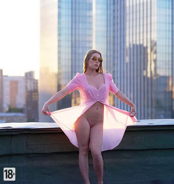 Ню съемка русской милфы в розовом платье на фоне высоток