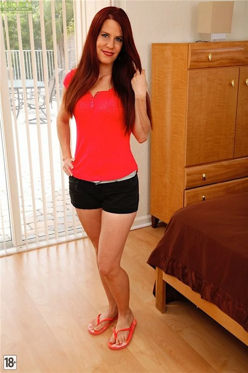 Рыжая женщина в спальне разделась догола, демонстрируя своё соблазнительное тело — маленькие груди, упругие формы и большую попу. Она возбуждённо гладит себя по бедрам, медленно приближаясь к бритой киске, и с наслаждением начинает дрочить, сводя с ума каждого зрителя своими откровенными движениями