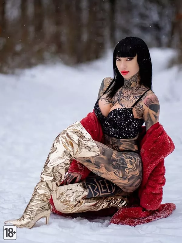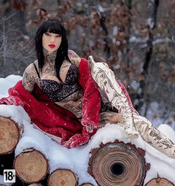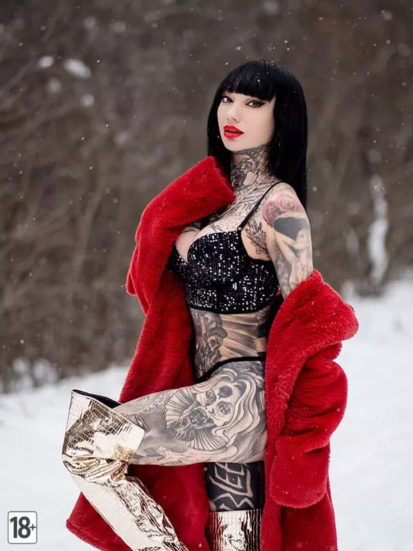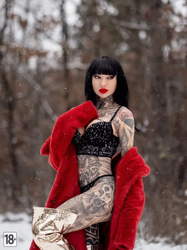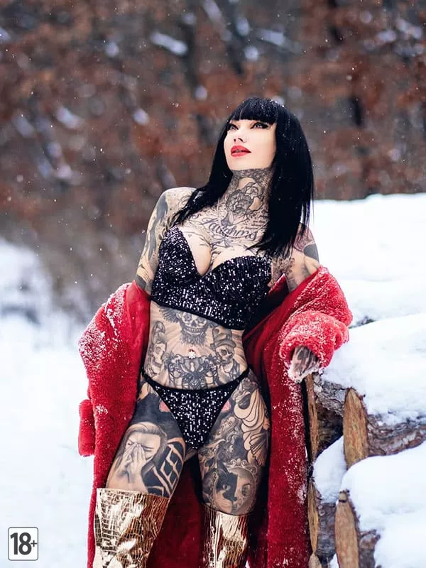 Фото этой разукрашенной татуировками с головы до ног брюнетки просто завораживает! Она красуется в зимнем лесу, в блестящем черном белье со стразами, что облегает все ее соблазнительные изгибы, и в яркой красной шубе, которая едва прикрывает аппетитные формы. Снег вокруг, морозный воздух, а она – огонь, готовая разжечь твои фантазии. Смотри, как татуировки переливаются на коже, подчеркивая ее дикую страсть. Эротика на природе в полном разгаре!