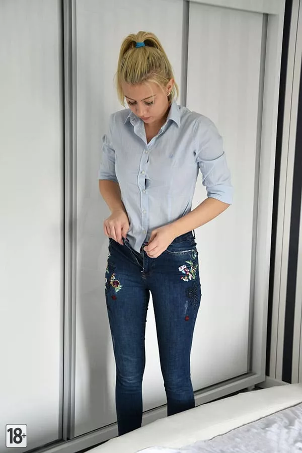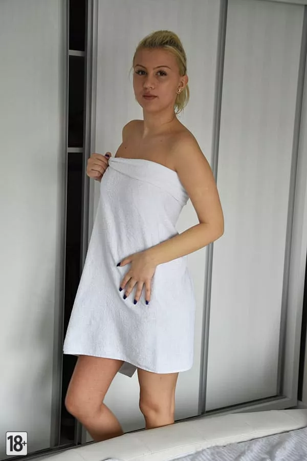 Эй, загляни, как молодая супруга, свежая после утреннего душа, готовится к рабочему дню! В спальне она надевает чистое белье на голое тело — момент простоты и красоты перед началом суеты.