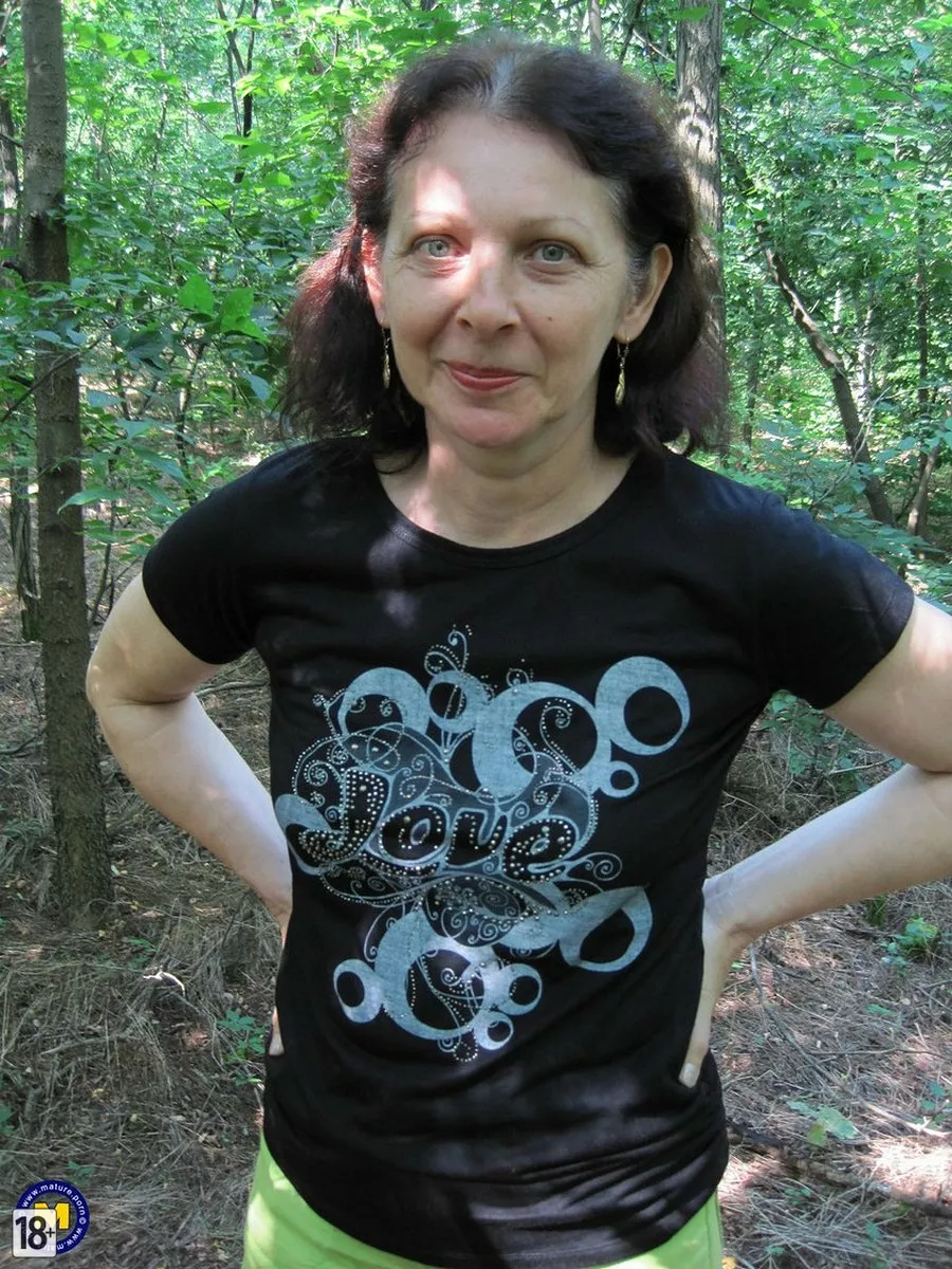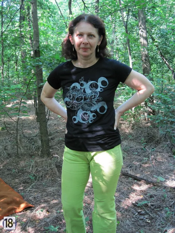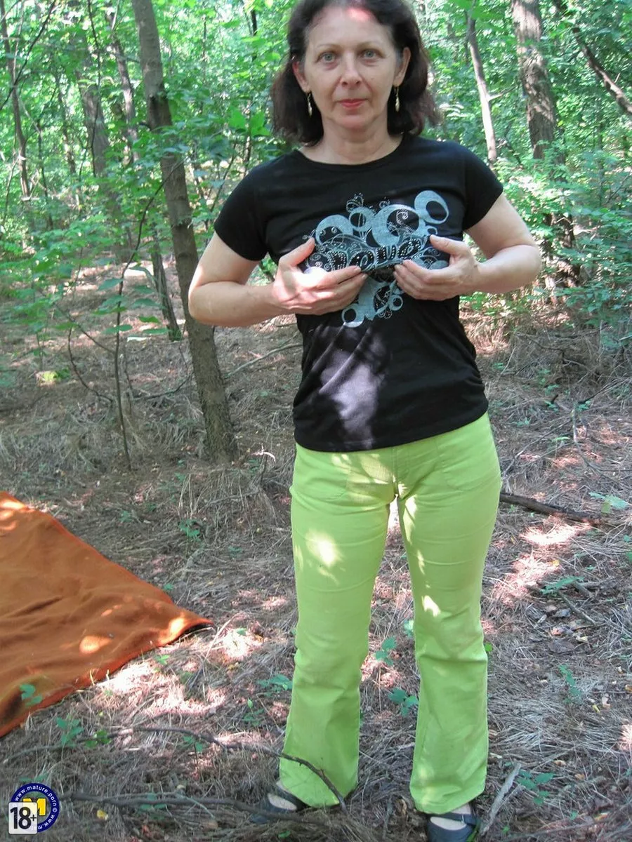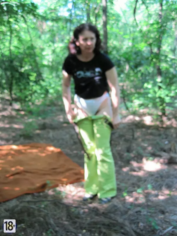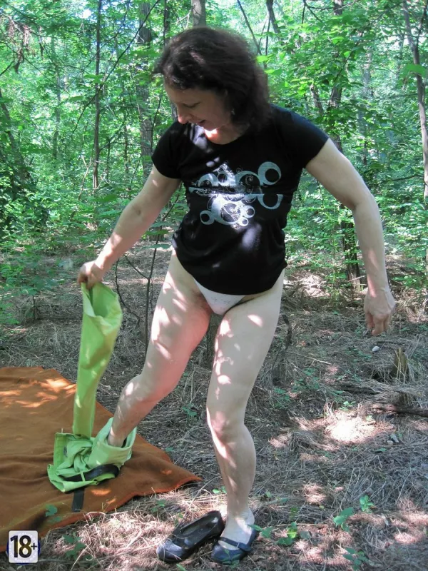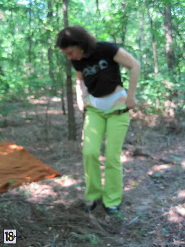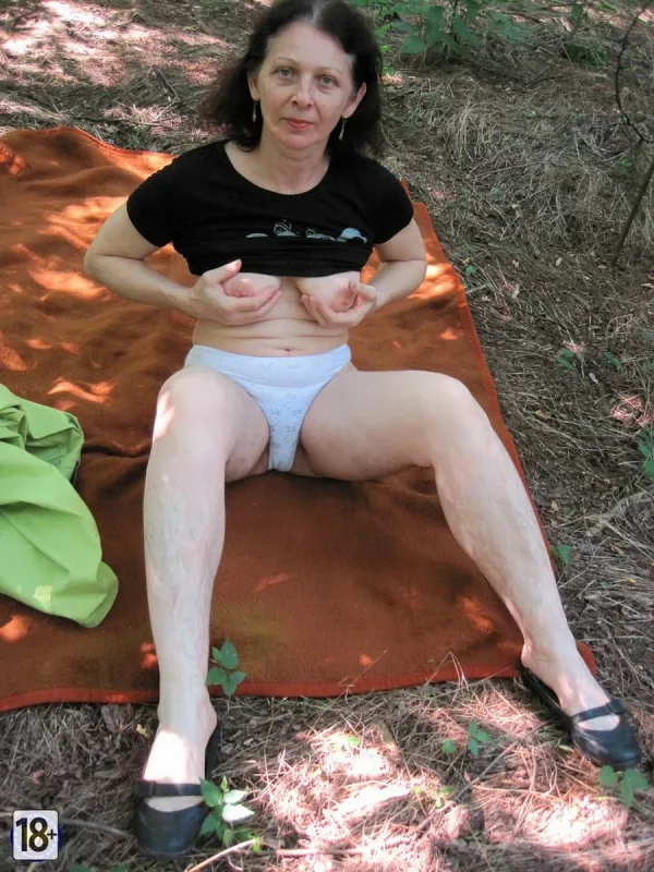 Фото зрелой жены в лесу — развалилась на коврике, медленно снимает одежку: сначала топик, обнажая сочные сиськи, потом трусики — и вуаля, густая растительность в интимной зоне, всё как у настоящей, опытной, желанной жены.