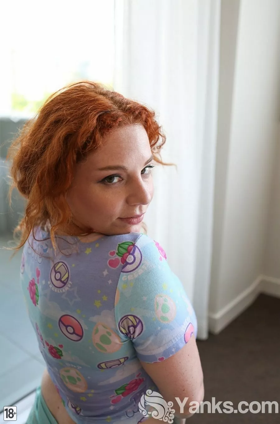 Фото сексуальной, натуральной, рыжей толстушкой, у которой пухлый зад и большие, мягкие груди, она раздевается до гола и эротично показывает себя, прикасаясь к своей бритой, чувственной pussy на расстоянии вытянутой руки.